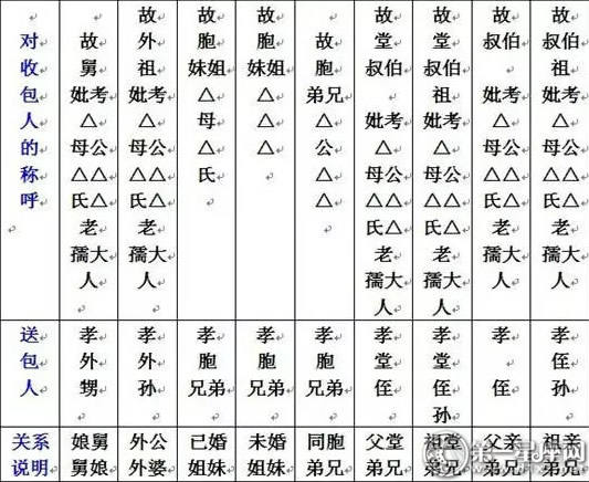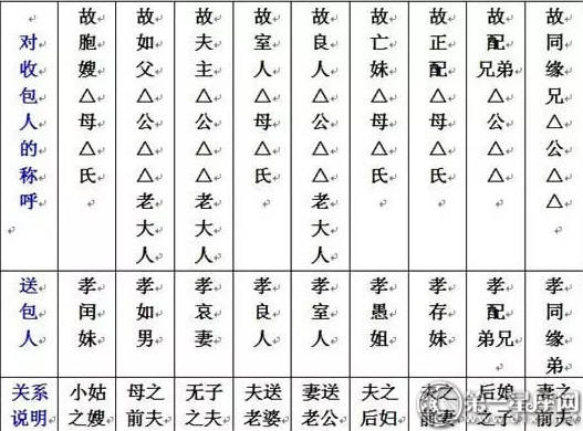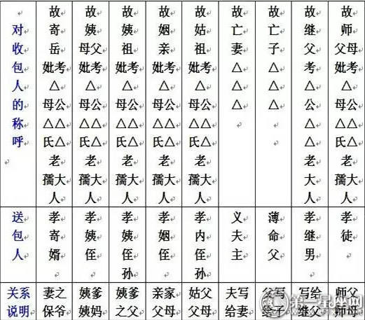 首先是需要在“故”字之后姓名之前写明先人与送包人的关系;其次是男人称考,女人称妣,但如先人是送包人的同辈和小辈的则不可称考妣,直接写明关系就行。