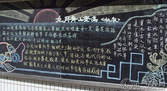 “又是过重阳,台榭登临处,茱萸香坠。”10月28日,农历九月初九,人们即将迎来2017年的,这是一个历史悠久的节日,登高、赏菊、吃重阳糕,喝菊花酒等饶富趣味的重阳节俗,延续千百年未曾断绝;这是一个富有诗意的节日,古往今来,多少文人墨客留下了重阳美诗词。那么就让为你整理重阳节黑板报图片大全,一起来欣赏。